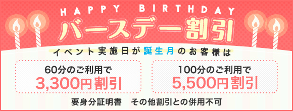 イベント実施日が誕生月のお客様は最大5,500円割引! 60分からのご利用が可能です。